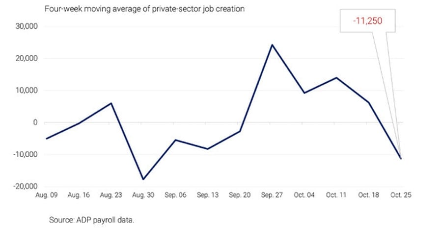 While the economic calendar remains thin due to the shutdown, ADP data showed private companies cut an average of 11,250 jobs per week in the four weeks ending October 25.