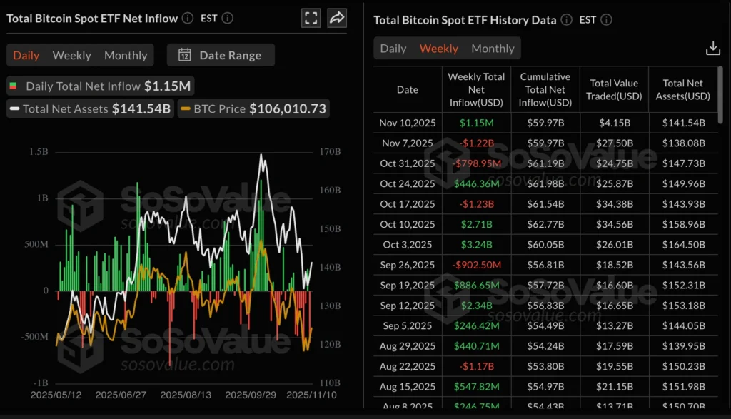 According to SoSo Value, ETF inflows stood at $1.15 million on Monday. In contrast, the previous two weeks saw outflows of $1.22 billion and $799 million. Total net inflows stand at $59.97 billion, with net assets at $141.54 billion as of November 10.