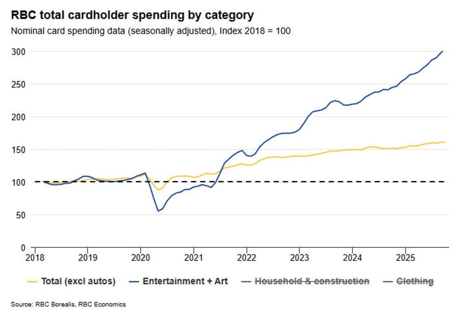 Canadian data from RBC showed consumer spending staying firm in October, with entertainment and dining leading gains, particularly in Ontario.