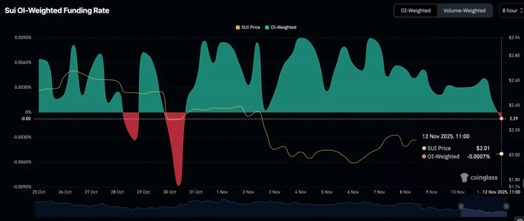 Sui (SUI) climbed back above $2.00 amid a 15% DeFi TVL drop to $1.35 billion, highlighting fragile sentiment and increased short positioning.